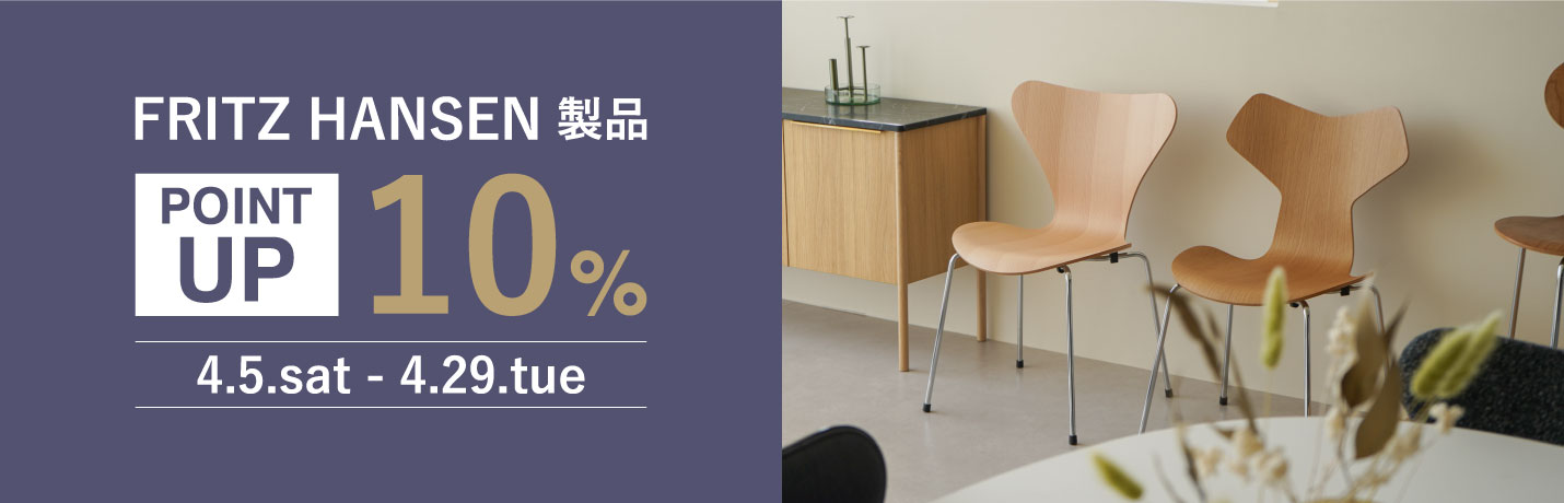 約3ヶ月というロングスパンのキャンペーンなのでじっくりとご検討いただけたらと思いますが、FRITZ HANSEN MONTHLYの期間中(4月29日まで)は実店舗なら購入特典がありますし、オンラインショップならポイントが10%還元となりますので、買うなら4月29日までが大変お得です!