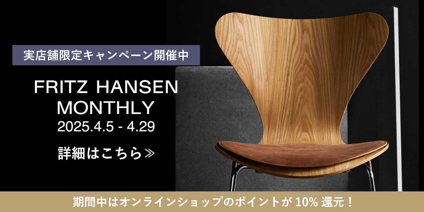 FRITZ HANSEN MONTHLYは2025年4月29日(火・祝)までの開催です。キナルバニラではご成約内容に応じた購入特典をご用意している他、vanillaオンラインショップではフリッツ・ハンセン製品が全て10%のポイント還元となっております。