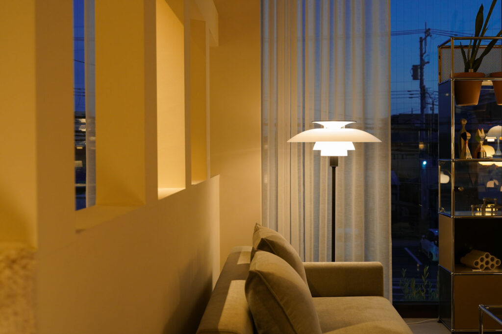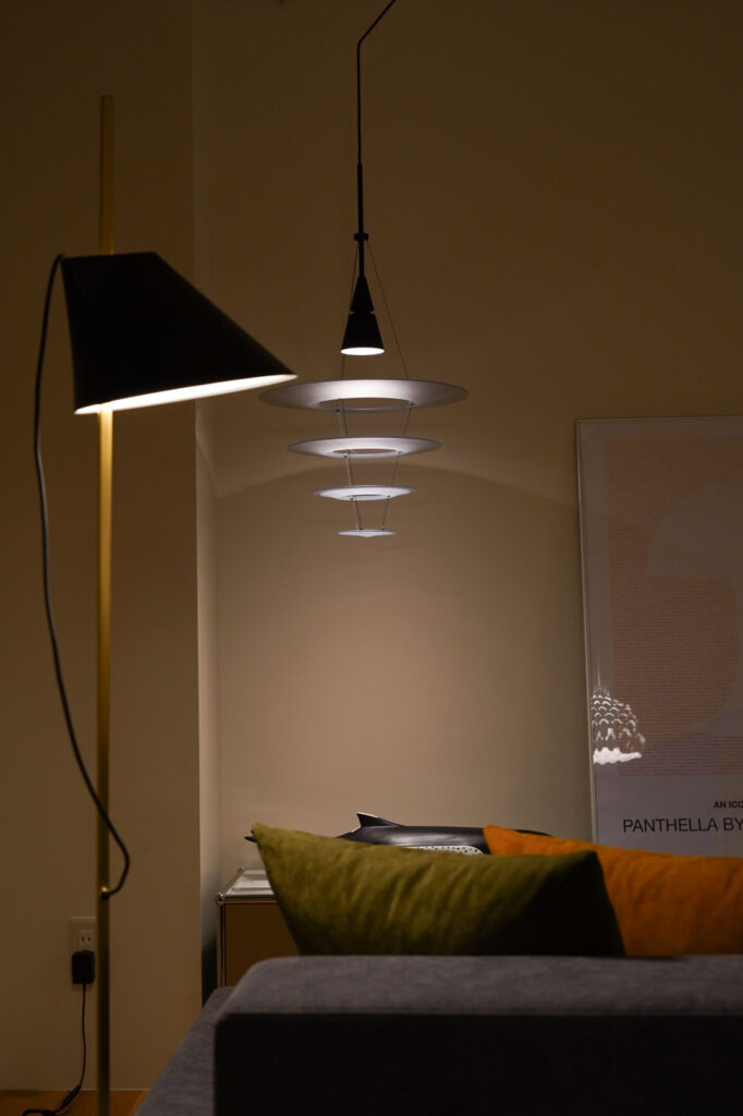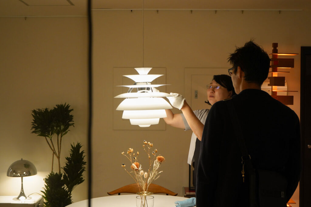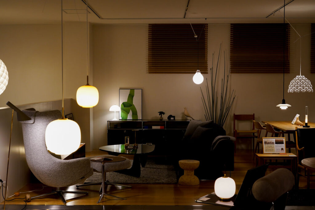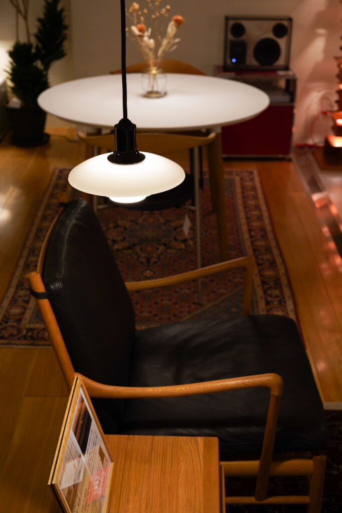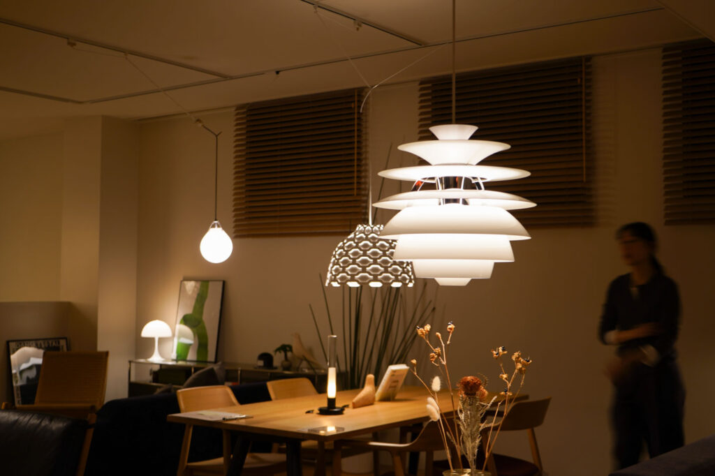 また、今回はメインの展示はほぼルイスポールセンの照明を使ってライティングコーディネートをしたのですが、その場所にしっくりくる照明が必ず見つけられ、複数使いでも照明と照明のデザインが喧嘩することなく組み合わせることが出来ました。