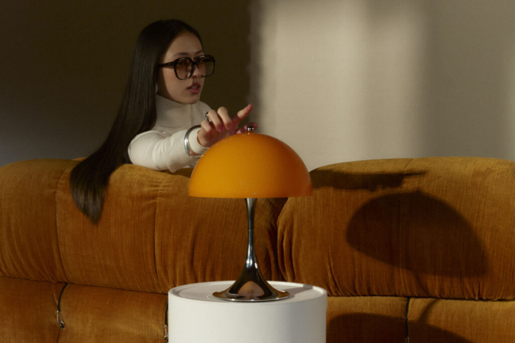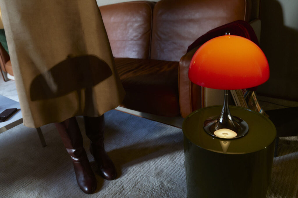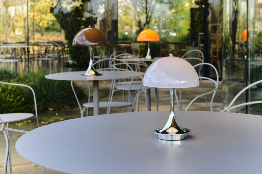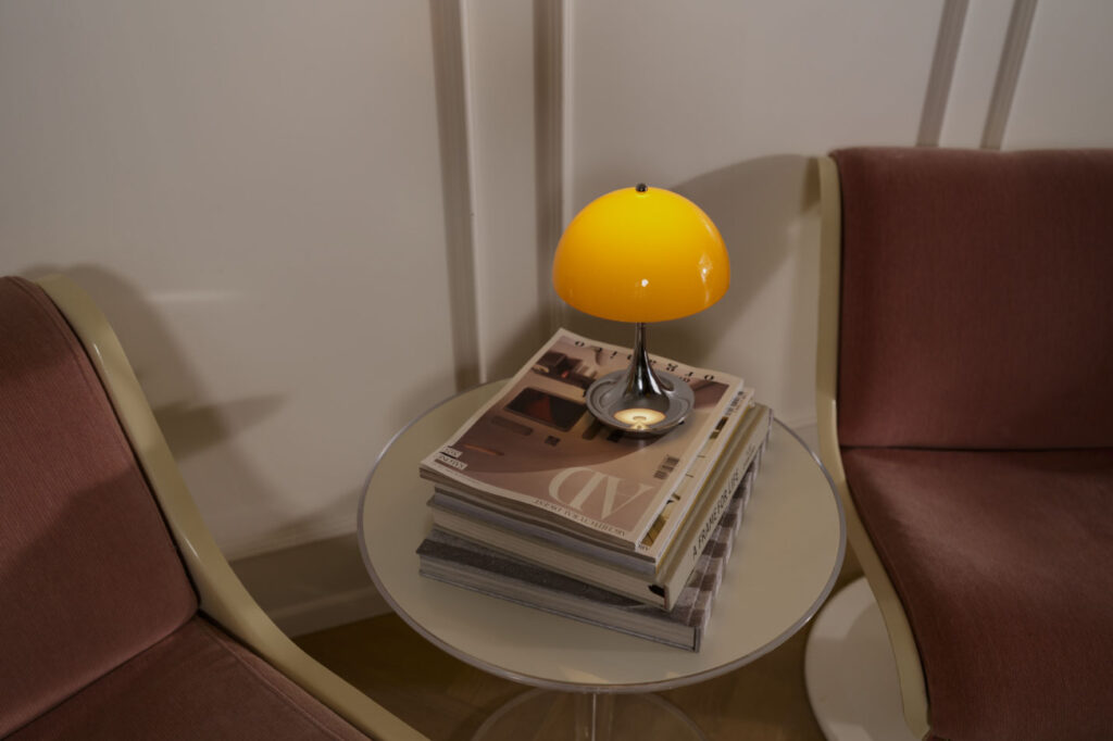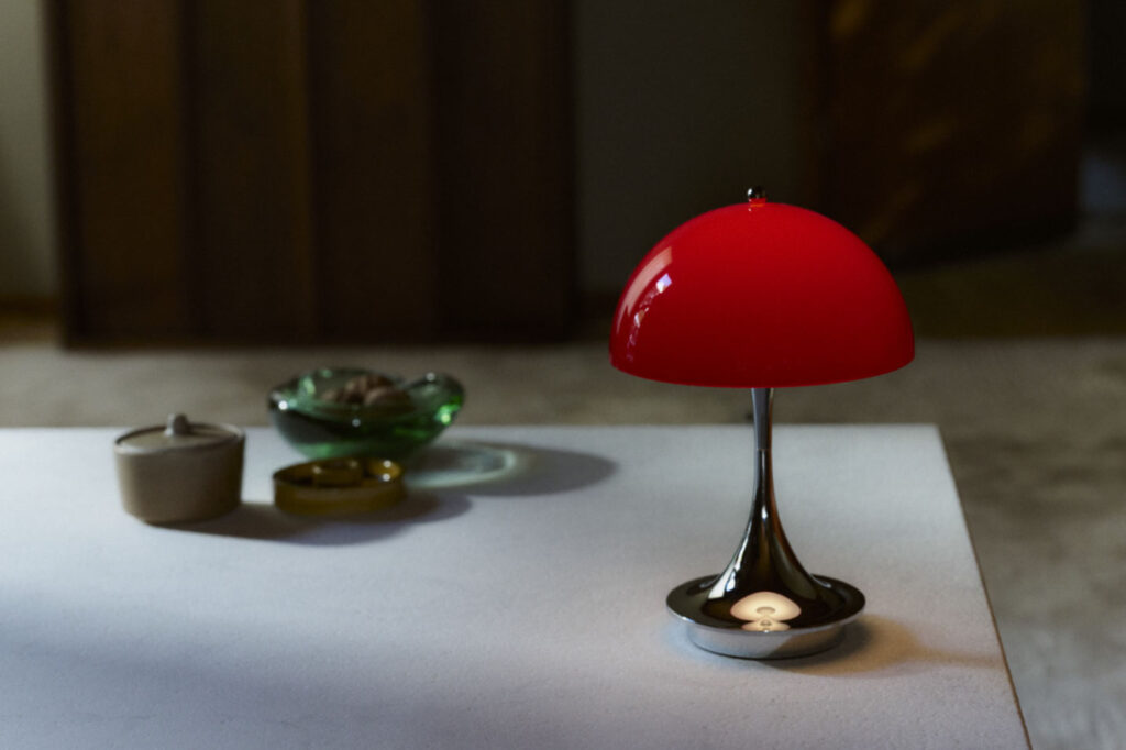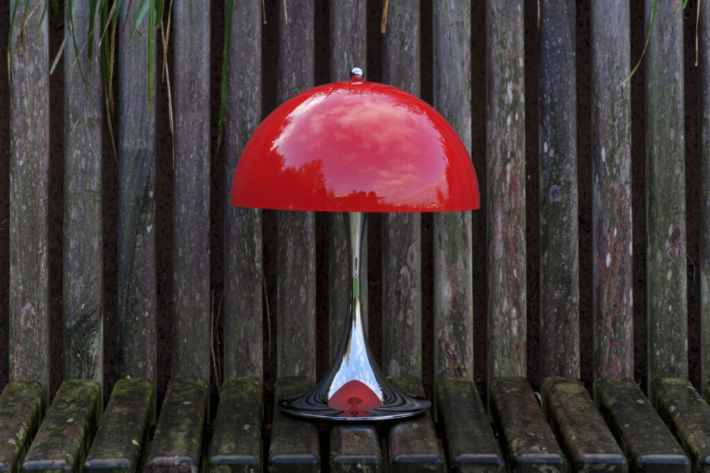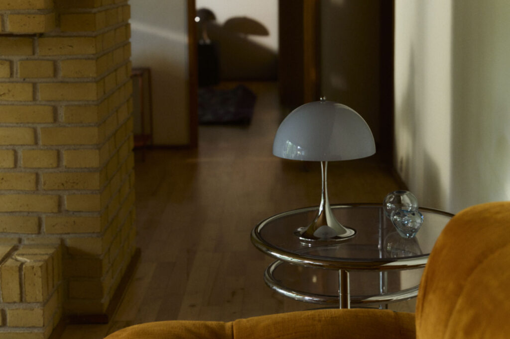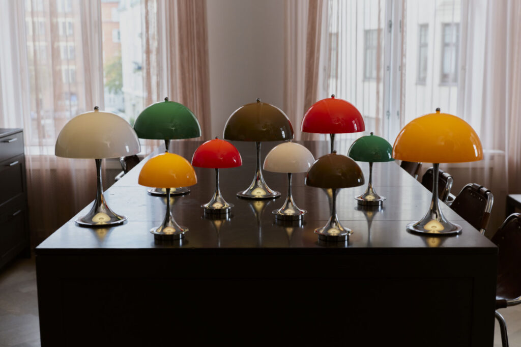 実はこのクローム仕上げのボディは1970年代当時も製造されていました。デザイナーのヴァーナー・パントンもお気に入りだったそう。この頃の北欧デザインといえば木材や白を基調とした、穏やかで機能的な表現が主流だった時代。その中でパントンは、強い色彩や有機的なフォルムを大胆に用い、「色が人の感情や行動に影響を与える」ことをデザインの軸に据えていました。