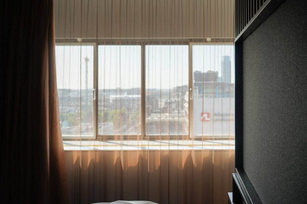 石造りの歴史的建物が続くコペンハーゲン中心部。その中でSASロイヤルホテルは、背の高いガラスの箱のように、すっと姿を現します。コペンハーゲンの中央駅を出てすぐの場所にあるホテルは、華やかな装飾はほとんど見られず、美しい直線で均整のとれたプロポーションだけで構成された外観で、街中を歩いていても思わず目を奪われます。