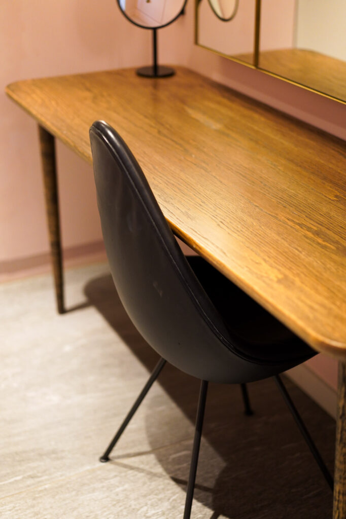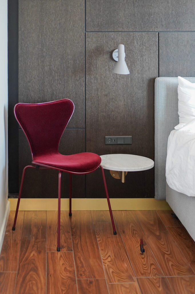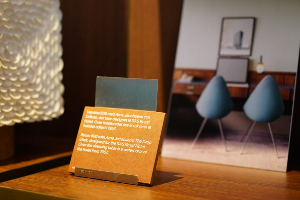 当然ではありますが、ベッドサイドのウォールランプや設られている椅子はもちろんヤコブセンのデザイン。他では見ることができない貴重なセブンチェアのカラーや、これまで数えきれない人が座ってきたであろうドロップチェアの経年変化は美しさそのもの。