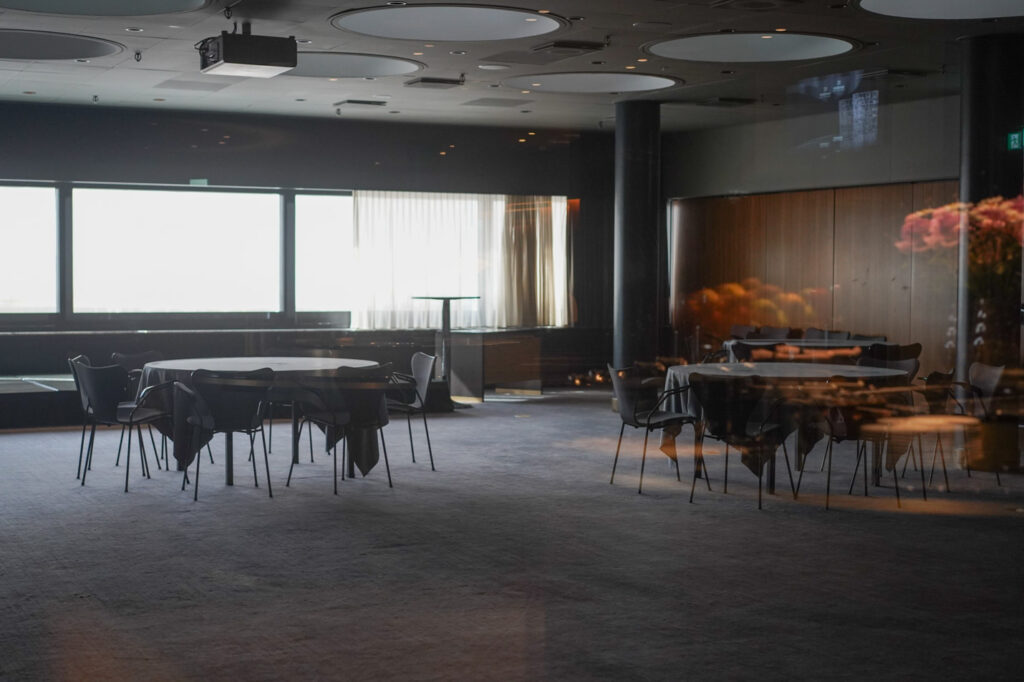 直線的な外観とは反対に、屋内の内装や家具は有機的なフォルムを持たせることで対比を表現。この辺りにヤコブセンが考える北欧特有の温かみが演出されているのかもしれません。また、当時は最上階にラウンジエリアがあり、そこから一望できる景色を邪魔しないように窓の高さに合わせたのがスワンチェアと言われています。