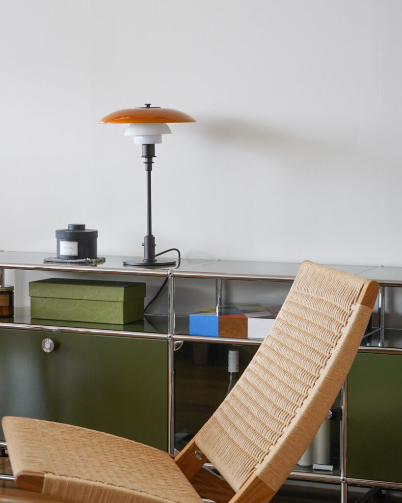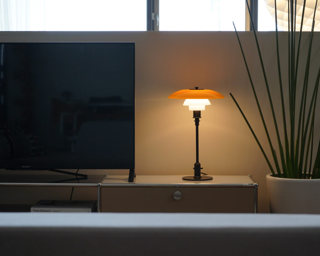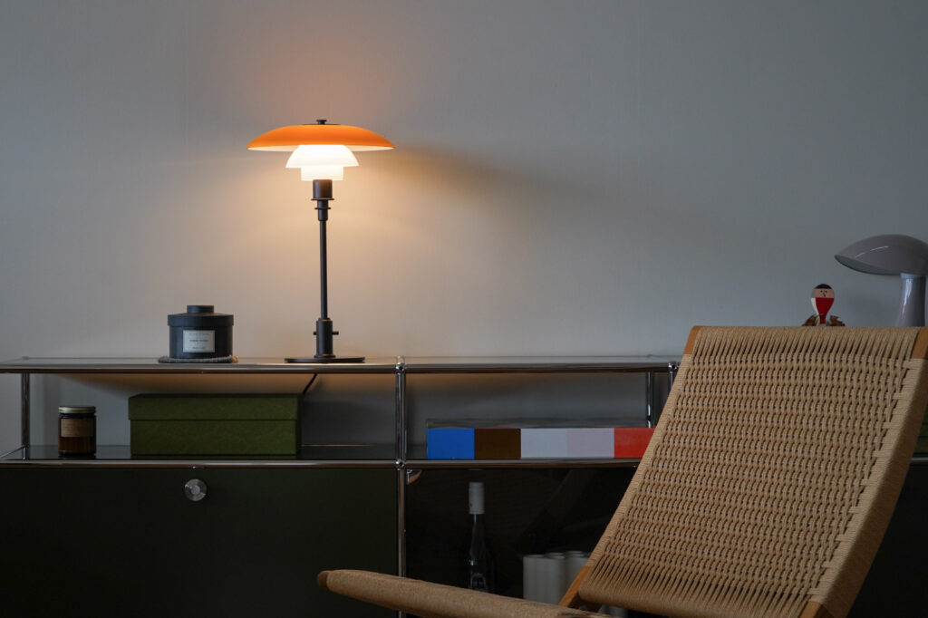 PHランプらしい柔らかな光を存分に楽しめるモデル。ペンダントランプではないので今あるお部屋にも取り入れやすく、リビングのサイドボードやベッドサイドなど、日常の空間に取り入れやすいサイズ感が魅力です。一回り小さいPH2/1テーブルも人気ですが、PH3/2が持つテーブルランプとしての存在感も楽しむことができます。